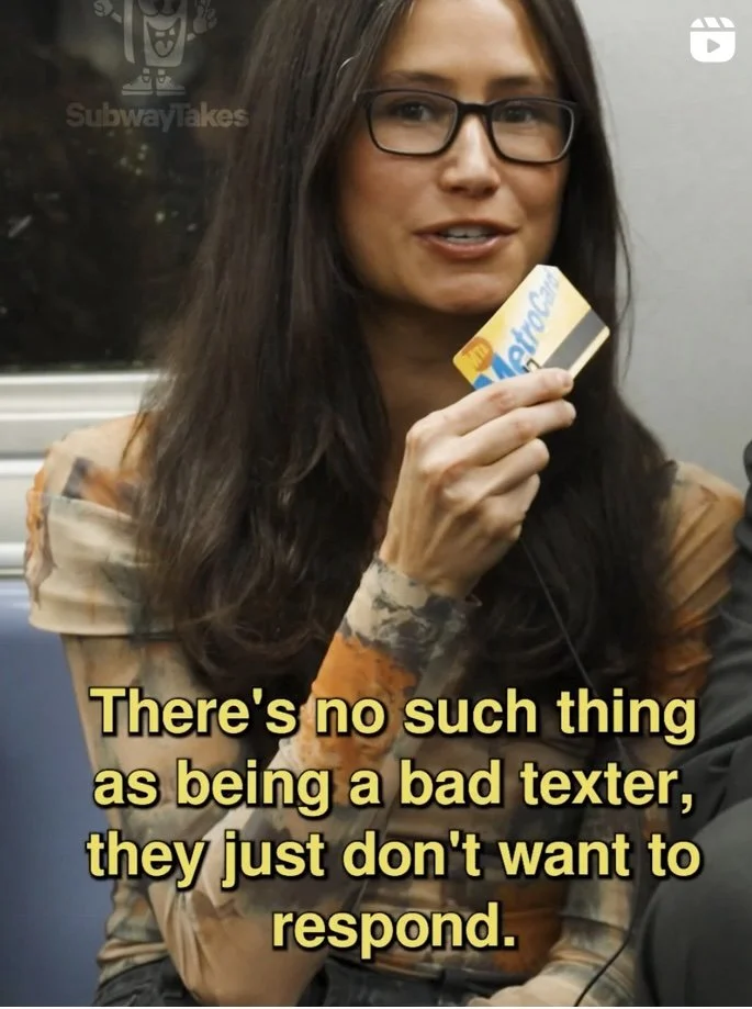 She ends by calling out what she sees as the two lies people trot out when they revisit a text thread and see they haven’t been responding: 1) “Oh, haha, didn’t see this!” or 2) “Weird, I drafted something and didn’t hit send.”